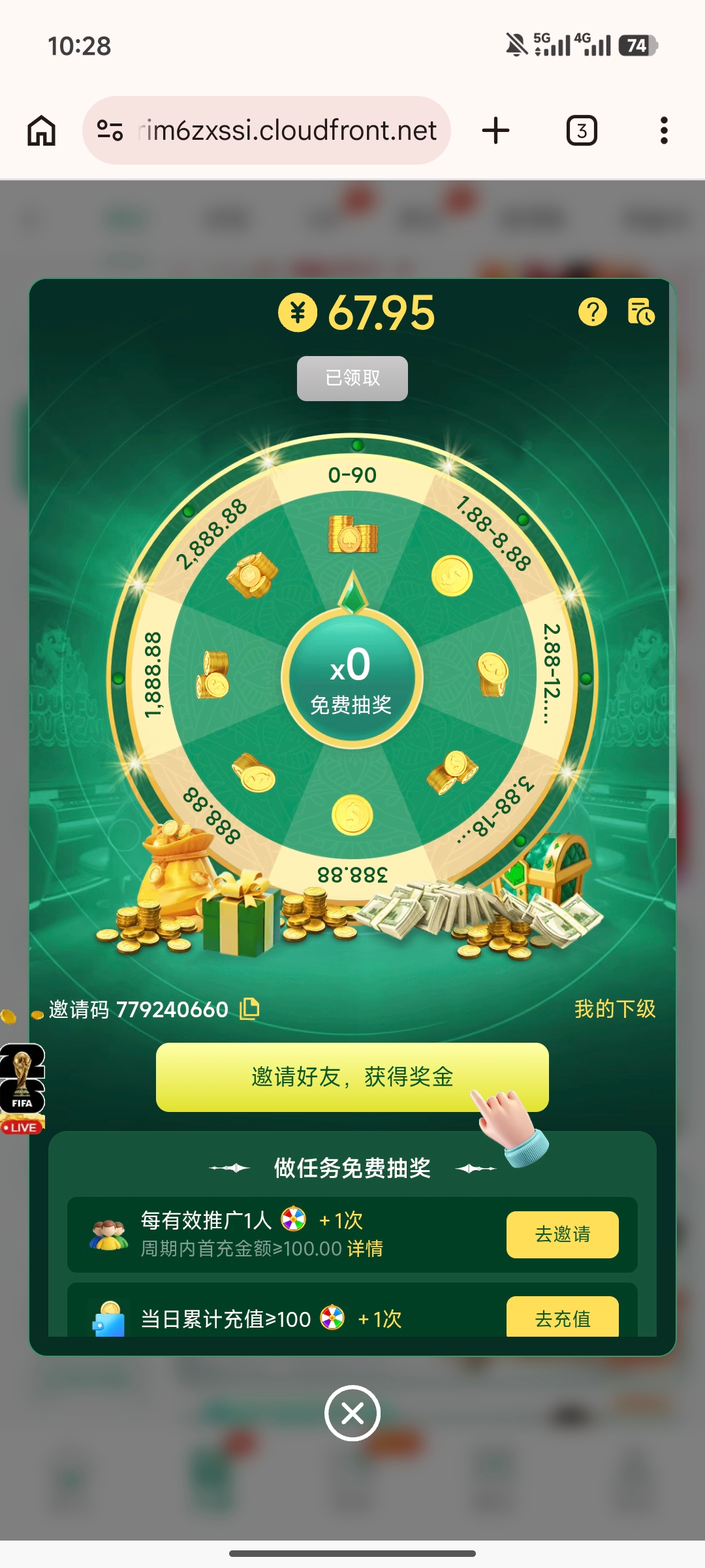 先去活动验证电话领了彩金,赢了就充20提现,这个平台还算稳的,目前没有人被黑过,可以上,另外那个转盘也可以试试看,转到多少都可以直接领取,不过先要有一笔充值才可以直接领取,隔壁论坛有人领了68没有拉人已经出了800块,可以上,有图有真相.